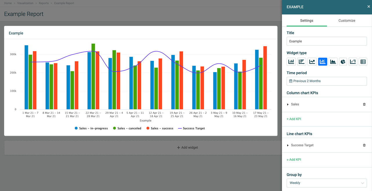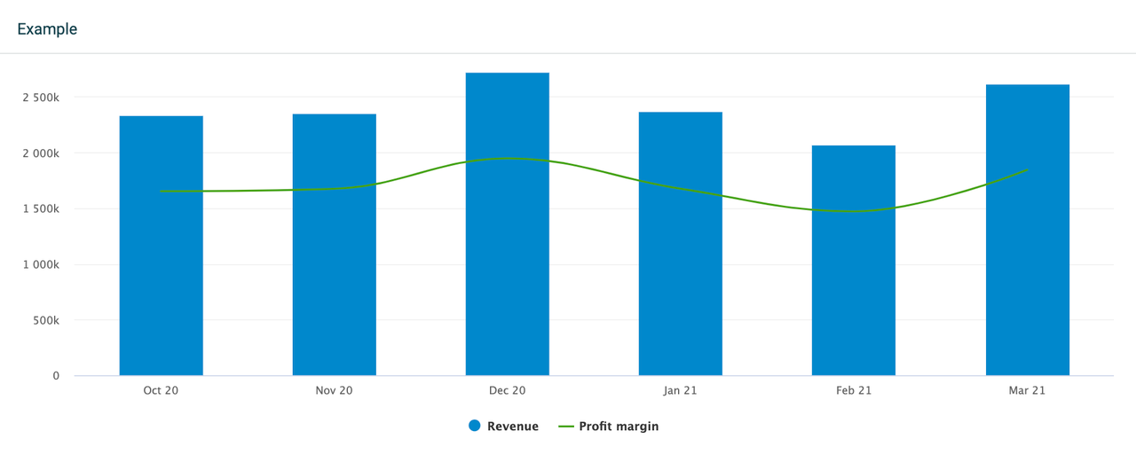 The combo chart is a combination of column and line charts. It allows you to display different types of data in one widget. The combo chart can be useful when you want to see, for example, the actual values of your data in comparison to a target value, revenue in comparison to the profit margin, or others.