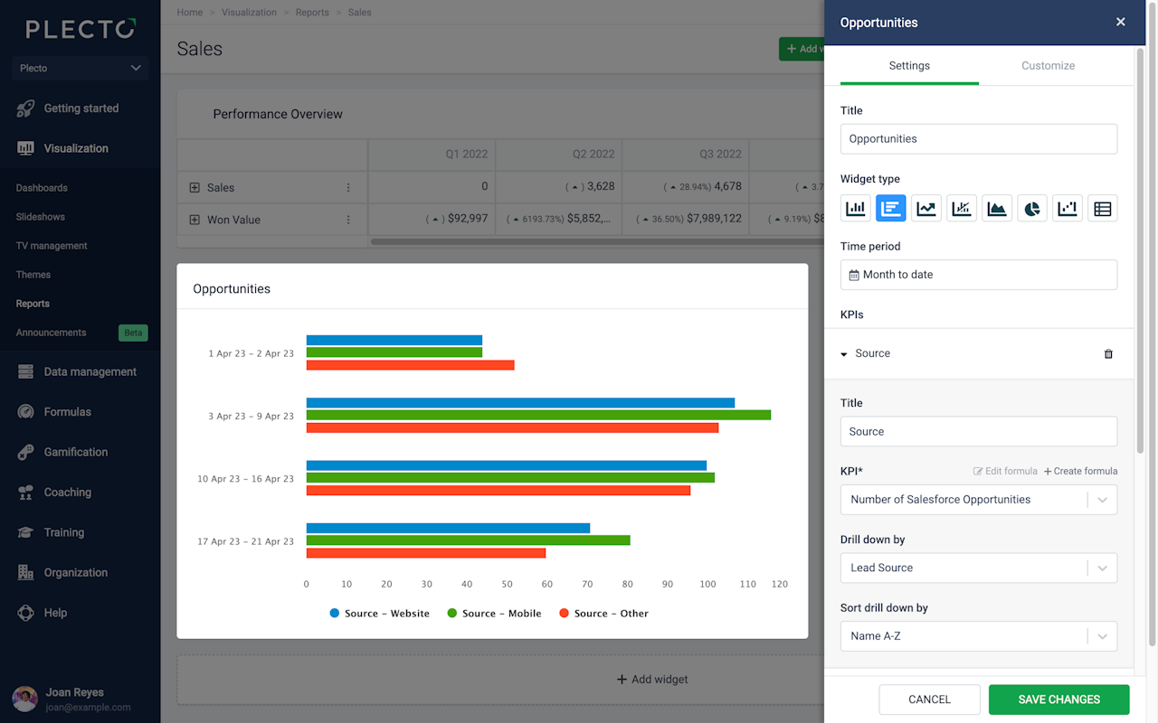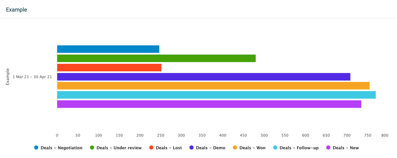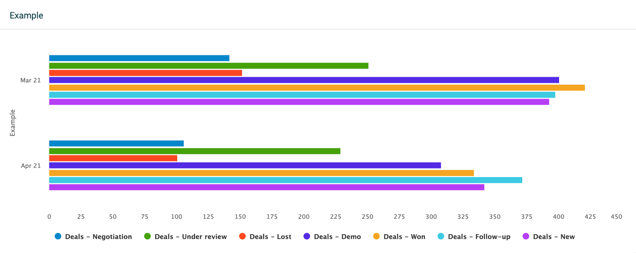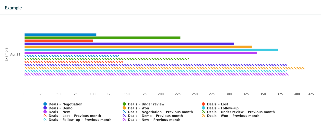 You can also choose to drill down your metrics by specific parameters, based on the fields available in your data source that the formulas are built on. For example, if you display the number of all sales deals, you can drill the data down by stage to see how many deals are open, lost, won, etc.